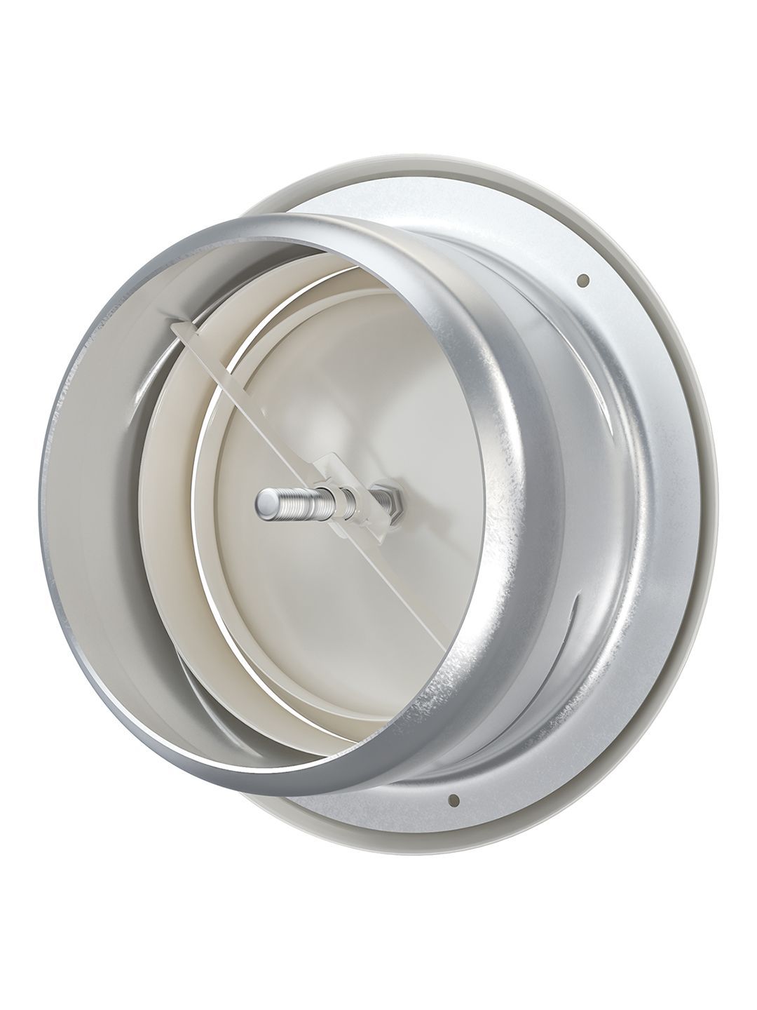 Поток воздуха регулируется вращением центральной части клапана. Монтируется в стену или подвесной потолок.