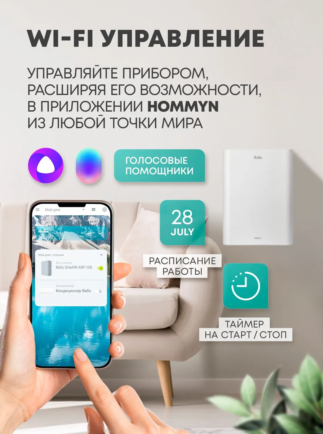 - Управлять прибором можно сенсорными кнопками на приборе и через мобильное приложение HOMMYN по Wi-Fi. Также прибор работает с голосовыми помощниками Алисой и Марусей. Приложение HOMMYN позволяет управлять прибором как в локальной сети, так и дистанционно и расширяет возможности прибора. С его помощью вы сможете настраивать расписание и режимы работы устройства по дням и даже часам.