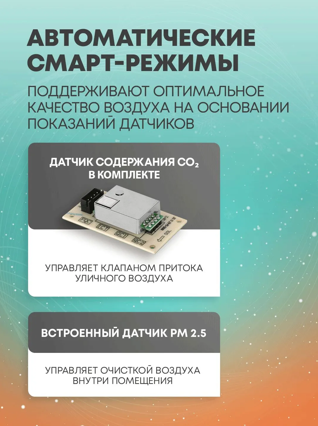 - Режим Авто доступен только при установленном датчике CO2. В режиме авто приточный очиститель самостоятельно включается и регулирует мощность подачи воздуха по показаниям датчика CO2, а также выключается, переходя в режим ожидания, достигнув хорошего уровня CO2. В данной комплектации датчик СО2 идет в комплекте.