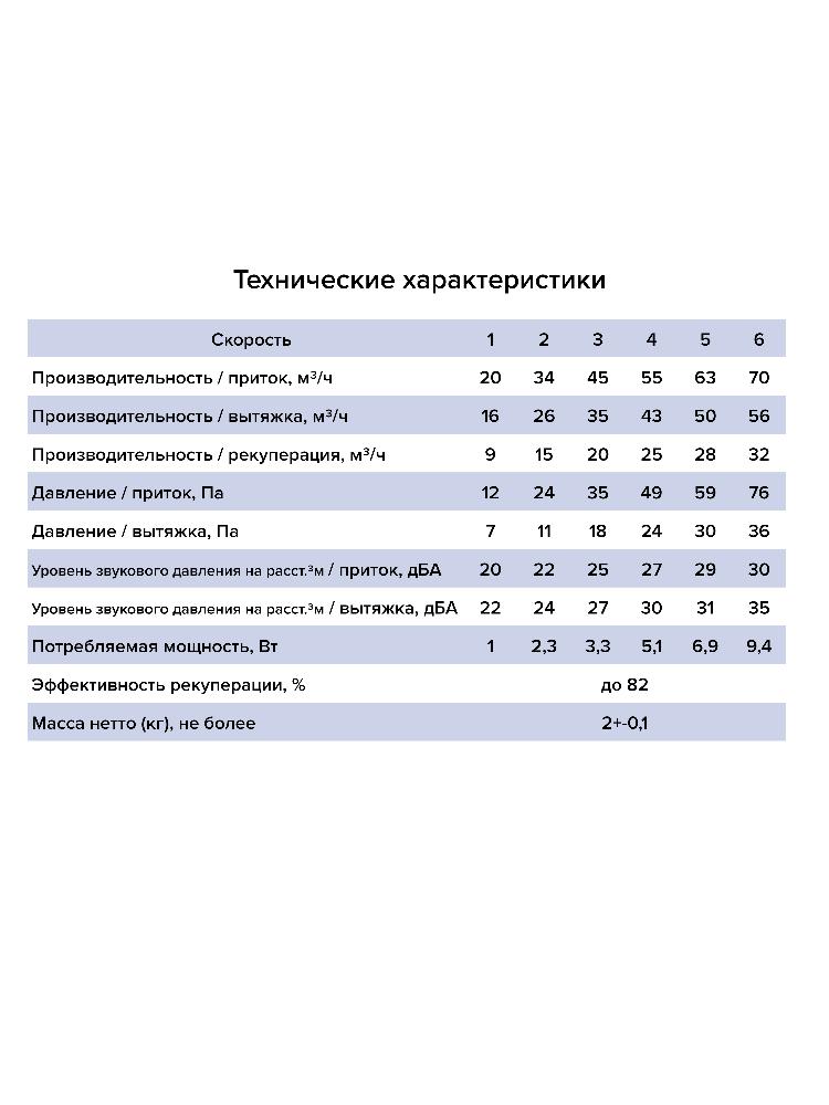 - 6 скоростей в режиме рекуперации 9/31/41/49/57/63 м3/час;